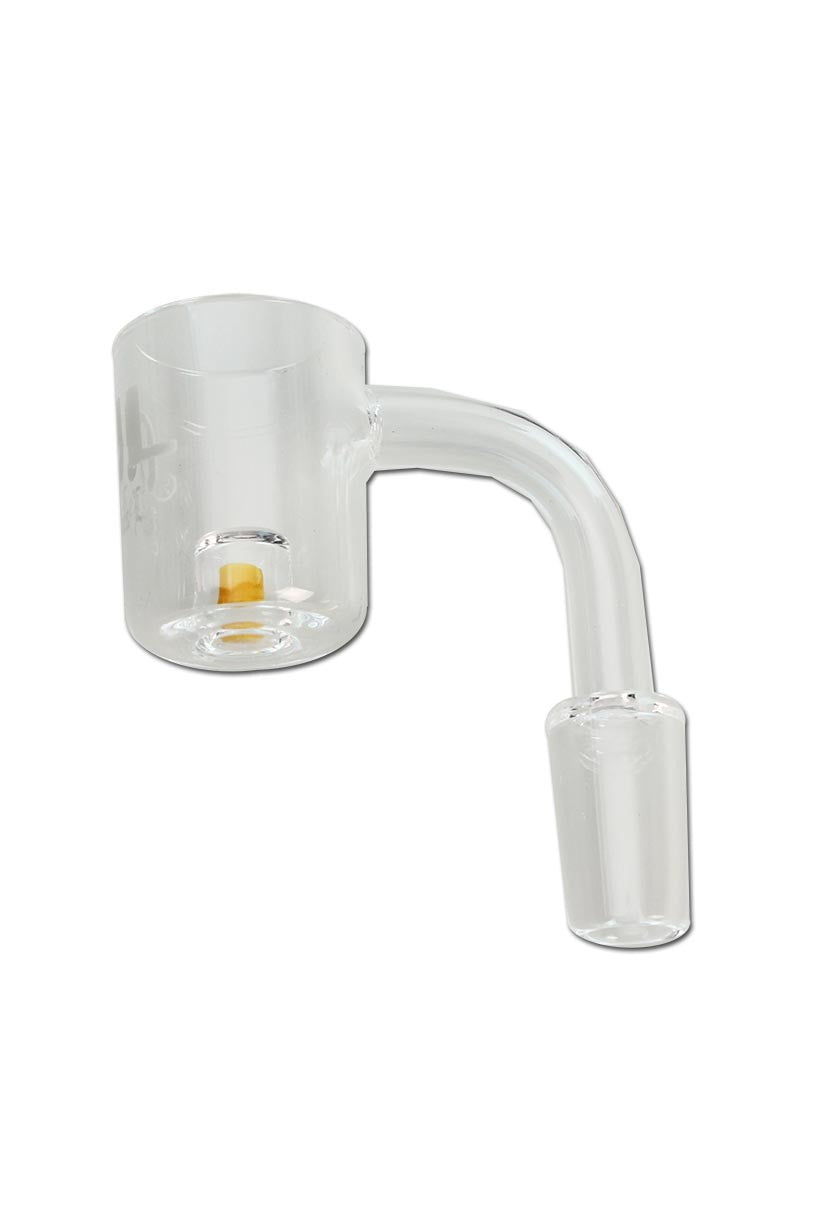 For the perfect indulgence of concentrates like oil or wax, the right temperature is one of the crucial factors. The oil banger with colour reactor from Black Leaf® contains a cadmium granulate which turns from yellow to red when hot. The reactor is a heat indicator and helps to keep and disperse the heat longer. It increases the surface area and improves the distribution of heat inside the banger so that more oil or wax can evaporate - for more taste and stronger hits! The banger is handmade of very heat-resistant quartz glass which heats up in a minimum of time, emits no harmful gases, it is food and medical grade material. The bowl is heated with a butane gas burner, only then the oil/concentrate is dabbed into the pan and the smoke inhaled. Enhance smoke development by using one of our numerous, separately available carb caps! Attention: The banger must be heated only at the bowl, otherwise the grinding can break in cause of the expansion of the material.